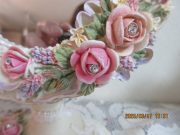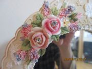 柄のようなホワイトのローズの上に華やか立体的なローズを重ねた卓上ミラーです。繊細に装飾されたローズに巻き付くリボン、さりげなく輝くライトストーンが上品な印象です。ミラーは角度調節が可能です。