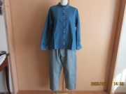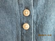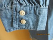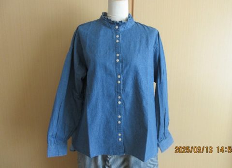 ネックの小さめのフリルが可愛いブラウスです。5.2OZオンスノデニム生地を使用しているので、オールシーズン着用できるような二区間で嬉しいです。2段釦使用がポイント、2段目は飾り釦です。ボタンを開けて羽織のように切るのも素敵です。
