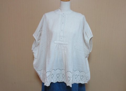 涼し仮名綿麻素材と繊細なエンブロイダリーレースが魅力なブラウス。ナチュラルな風合いと女性らしいディティールが絶妙にマッチし、春夏スタイルにぴったりの一枚。綿麻ならではの軽やかさと通気性の良さが特徴。リネン特有のシャリ感がありながらも、コットンが混ざることで肌あたりは柔らかく、着るほどに馴染むナチュラルな素材感です。裾にはエンボロイダリーレースが施され、動くたびに軽やかな表情を見せてくれます。方のタックデザインや胸元のボタンディティールがアクセントになり、シンプルながらもこなれ感のある仕上がりに。袖部分は程よくゆとりがあり、リラックスして着こなせます。