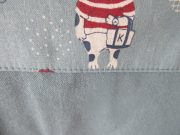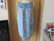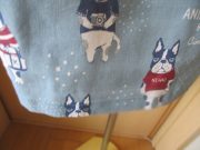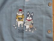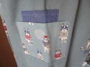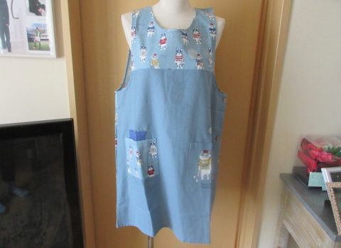 旅行コーデのシナモンとパウロ、今回の旅先はどこかな?切替プリント使いの脱ぎ着しやすい脇開きエプロンです。後ろ見ごろにはシナモンとパウロのプリントをたっぷり使いました。