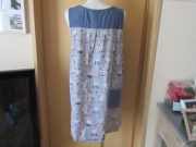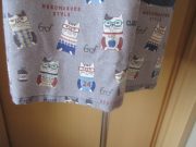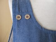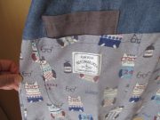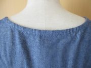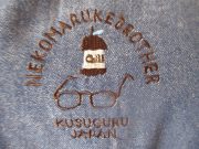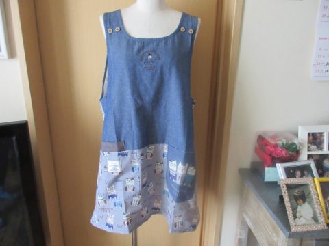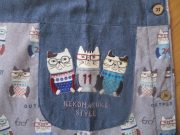 デニム素材を装ったブルーは、ネコまるけのスタイルにぴったりです。ネコまるけさん達はお気に入りのセーターを着て集まっていただきました。一番スタイリッシュなのは誰?胸元にワンポイント、すっきり見える位置で切り替えた定番の脇開きエプロンです。前身ごろと後ろ見ごろのイメージががらりと変わる生地使いです。